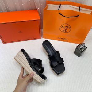 Hermes Black Oran Wedge Platform Sandal Heel With OG Box & Carry Bag Black Leather